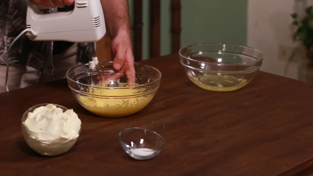 Lo que tenemos que realizar ahora es muy sencillo. Tenemos que añadir el mascarpone a la mezcla de yemas y azúcar. Podeis ir añadiendo el mascarpone poco a poco. Pero si os soy sincero, como podeis ver en el video… lo podeis añadir todo de golpe y os queda igual de bien. Una vez añadido el mascarpone teneis que mezclarlo bien con la batidora.